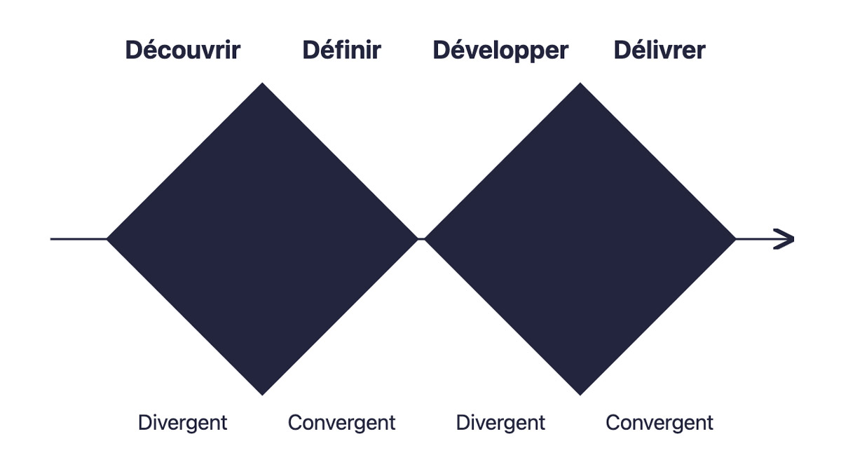 Chaque diamant illustre le passage d’une pensée divergente, où l’on explore de nombreuses idées, à une pensée convergente, où l’on synthétise et affine les meilleures pistes.